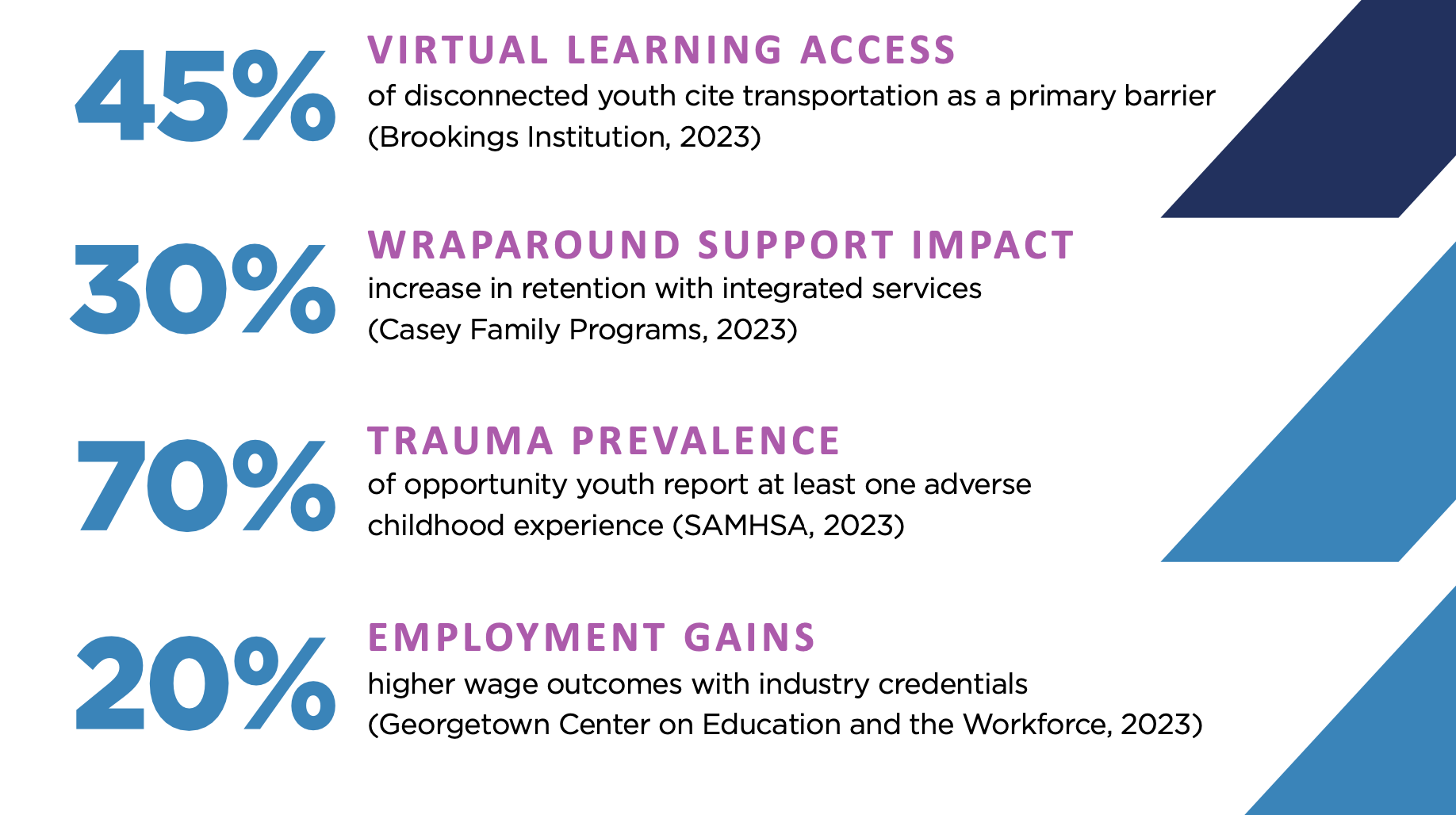 Virtual, asynchronous learning overcomes barriers of transportation, scheduling conflicts, and geographic isolation common among opportunity youth (Brookings Institution, 2023).